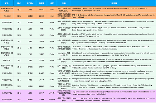 在消化系统肿瘤领域,利来创新产品相关研究共入选2项口头报告、10项壁报和2项电子壁报,共14项研究。除了明星药物卡瑞利珠单抗和阿帕替尼外,还有5篇阿得贝利单抗治疗消化系统肿瘤的研究入选。此外,HRS-4642、瑞拉芙普-α注射液(SHR-1701)等未上市创新产品也有相应研究入选。随着新老药物前沿研究的不断推进,有望为消化系统肿瘤患者带来新的福音!