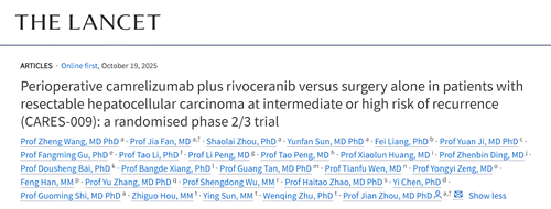 [2]Wang Z, Fan J, Zhou S, et al. Perioperative camrelizumab plus rivoceranib versus surgery alone in patients with resectable hepatocellular carcinoma at intermediate or high risk of recurrence (CARES-009): a randomised phase 2/3 trial. Lancet 2025. Published Online. https://doi.org/10.1016/S0140-6736(25)01720-9.